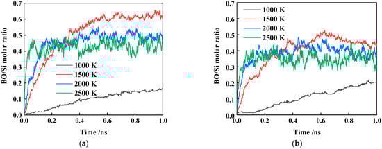 The content of bridging oxygen (BO) reflects the overall degree of polymerization of C-S-H. The higher the amount of BO, the higher the degree of polymerization, and the more favorable it is for the formation of macro strength. As shown in Figure 7, the degree of polymerization of all C-S-H systems can reach a stable state from 0.3 ns, indicating that the reaction time is long enough. The higher the temperature is, the greater the initial polymerization rate (the initial slope of curves) is. The final amount of BO is relatively small with the temperature, indicating that the polymerization degree of gel decreases. However, by increasing the proportion of silicon to C/S = 1.1, the hydration rate (slope) is relatively lower, and more BO is formed (Figure 7a) compared to those with C/S = 1.8 (Figure 7b).