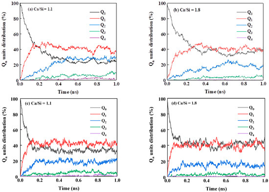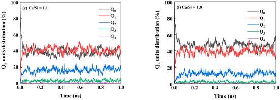 The distribution of different silicon atoms (Qn, n = 0–4) can reflect the topological structure of the C-S-H gel. Qn corresponds to the type of silicon atom connected to n BO. The content of Qn can characterize the change in the topological structure of C-S-H during the polymerization reaction. A larger n in Qn indicates a more polymerized structure, which is favorable for the development of macro strength. Before the reaction, all conformations contain only the Q0 unit, as shown in Figure 8. The relative contents of Q1 and Q2 gradually increase, and a certain number of Q3 and Q4 units form with the continuous consumption of Q0 units in reactions. For the same C/S, the reaction generates less Qn (n = 1–4) and retains more Q0 when the temperature increases (Figure 8a–f). It shows that high temperatures weaken the degree of sufficient hydration and stability of the gel structure. For the same temperature, with the increase in silicon proportion, the generated Qn (n = 1–4) increases, especially Q2, Q3, and Q4 (Figure 8a–f), indicating that reducing C/S is helpful in forming a more stable microstructure.