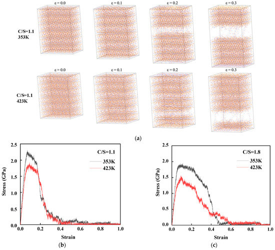 Stress–strain curve of C-S-H during tension with different temperatures and C/S. (a) Development of the model in tension process with C/S = 1.1 at different temperatures; (b) stress–strain curve with C/S = 1.1; (c) stress–strain curve with C/S = 1.8.