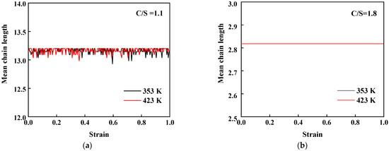 Mean chain length of silicate structure of C-S-H with different C/S ratios as a function of strain. (a) C/S = 1.1; (b) C/S = 1.8.