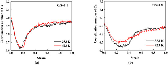 Coordination number of Ca of C-S-H with different C/S ratios as a function of strain. (a) C/S = 1.1; (b) C/S = 1.8.