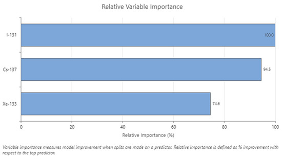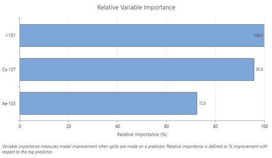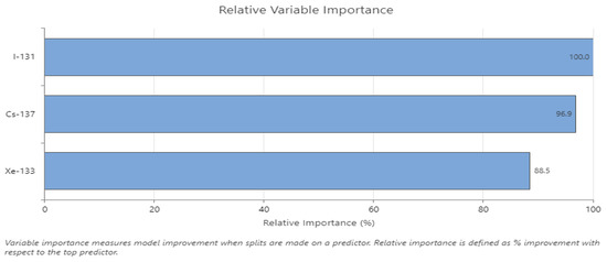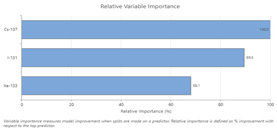 The ranking of predictors that classify the three accidents is shown as a bar graph (Figure 2, Figure 3, Figure 4 and Figure 5). The predictors’ ranking was similar across three months, August-summer, Winter-January, and Fall-October, with I-131 the most important, followed by Cs-137 and Xe-133. For April (spring), Cs-137 was the most important, followed by I-131 and Xe-133.