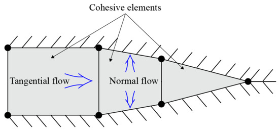 Assuming that the fluid within a crack is continuous and incompressible, the fluid flow within a cohesive element can be divided into tangential and normal flows (Figure 2).