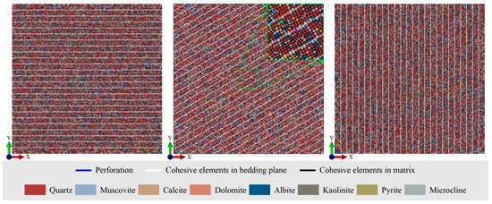 As a mineral assemblage, rocks are composed of various mineral particles with mineral heterogeneity, and the BP of shale is extremely developed. Therefore, it is necessary to consider both the mineral heterogeneity and bedding anisotropy of shale. The types and proportions of minerals contained in the shale were determined based onshale X-ray diffraction results [28] (Table 1). In Python, mineral particles were represented by grid elements, and strength parameters were applied to different minerals to determine the heterogeneity of shale minerals.