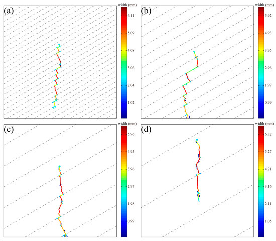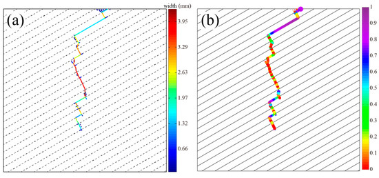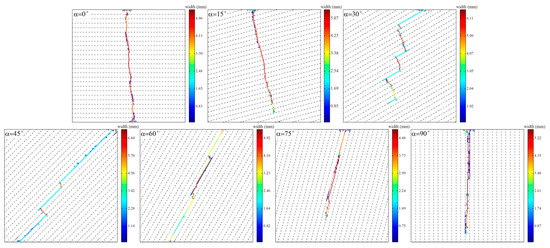 The fracture-propagation paths were extracted at seven BP angles (Figure 5). Different colors represent the fracture widths, which increased from blue to red. According to the fracture path, the overall propagation direction of the fracture was along the direction of the maximum principal stress after the fracture started from the perforation. When the BP angles were set to 0° and 15°, the fractures ruptured through the layer and spread along the direction of the maximum principal stress, and the fracture width was large. When the angle of the BP was greater than 15°, the BP hindered the propagation of fractures along the direction of the maximum principal stress, resulting in complex fracture patterns in the cross-layer and bedding slip fractures. With an increase in the bedding angle, the fracture path gradually tended to become a single bedding slip fracture from the cross-layer fracture. When the BP angle was 30°, the phenomena of cross-layer and bedding slip fractures were the most obvious, the fracture path was the most complex, the fracture width of the cross-layer fracture was generally larger than that of the bedding slip fracture, and the cross-layer fracture hada high fracture width (which is more conducive to proppant migration and filling).