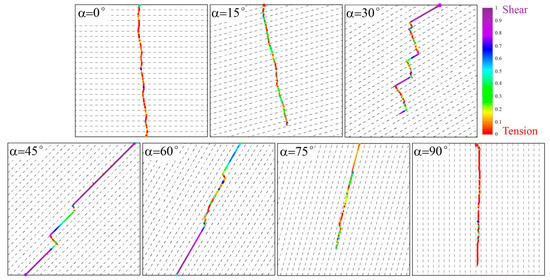 The AE parameters were obtained using Python, and a AE-location map was drawn using MATLAB (Figure 6). The AE energy and fracture type are represented by the size and color of the AE-event points, respectively. Red points represent pure tensile fractures, and purple points represent pure shear fractures. According to the AE-location map, the overall fracturing process was dominated by tensile fractures that were mainly manifested in cross-layer fractures. The bedding slip fractures were mainly of the shear-fracture type, which is caused by dislocation sliding due to the opening of the BP under the action of hydraulic fracturing. During actual hydraulic fracturing construction, the tensile fracture readily closes under the action of in situ stress. Although proppants provide support, tensile fractures have higher proppant-strength requirements, whereas shear fractures are difficult to close. Therefore, the formation of bedding-shear fractures is conducive to the exploitation of tight oil and gas. With an increase in the BP angle, the fracture underwent discontinuous dislocation expansion, which was no longer obvious after 45°, and the BP became the main controlling factor of HF propagation.