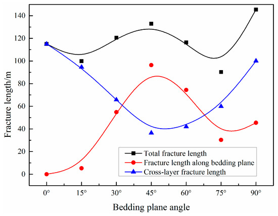 In addition, the fracture lengths of the seven BP angles were extracted (Figure 7). The total lengths of the fractures at the seven bedding angles were of the ‘W’ type, and the lengths of the cross-layer fractures were of the ‘U’ type. At 0°, the lengths of the cross-layer fractures were equal to the total length of the fractures. At this point, the BP did not significantly influence the HF propagation, and this result may be related to the strength of the BP, which requires further detailed research. When the BP angle was 45°, the cross-layer fracture was the smallest, and the ability to capture HFs was the strongest. The length of the bedding slip fractures increased gradually from 0° to 45° and decreased above 45°, but there was a small increase at 90°. When the BP angle was 90°, because the perforation did not completely coincide with the BP, the ground stress had the main advantage of fracture propagation, and the fracture extended along the direction of the maximum principal stress. Owing to the weak strength of the BP, the pore water pressure induced initiation and propagation of the BP near the HF at the same time as HF propagation. Therefore, when the BP angle was 90°, the bedding fracture was incomplete. The length of the cross-layer fracture at 30° was close to that of the bedding slip fracture, indicating that the cross-layer and bedding slip fractures occurred simultaneously, which is conducive to the generation of a complex fracture network.