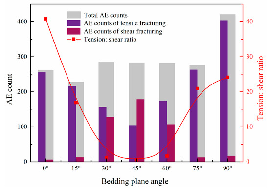 Tensile fractures were considered dominant when MMIXDME was less than 0.5, and shear fractures were considered dominant when the value was between 0.5 and 1. Based on this, the numbers of AE events for different rupture types were determined using MATLAB (Figure 8). The numbers of AE events of the tensile-fracture type first decreased and then increased with increasing angles and were generally greater than those for the shear-fracture type (except at an angle of 45°), indicating that the tensile fracture was dominant. However, the numbers of shear-fracture events showed an opposite trend to that of the number of tensile-fracture events, which first increased and then decreased. When the angles were 30°, 45°, and 60°, the numbers of shear-fracture events were highest, and the tensile-shear ratio was lowest. When the BP angle was 30°, the numbers of tensile and shear-fracture events were similar. The cross-layer and bedding slip fractures were tensile and shear failures, respectively. Therefore, the alternating complex propagation process of cracks was also reflected in the AE-fracture type.
