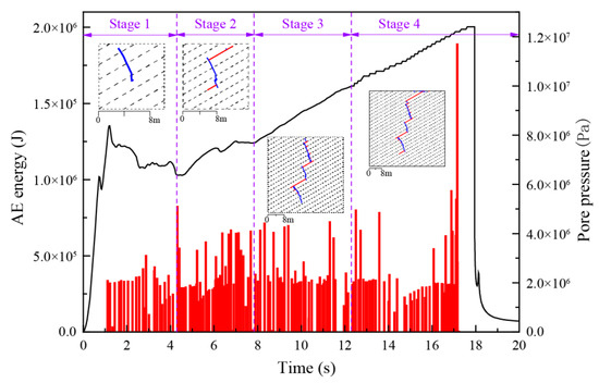 The pore-water pressure curves and AE-energy characteristics of the perforating orifice at different BP angles were extracted. In this study, a BP angle of 30° was used as an example for analysis (Figure 9). According to the degree of fluctuation of the pore-water pressure curve and the distribution characteristics of the AE energy, the fracturing process could be roughly divided into four stages. The fractures started at the first stage and then continued to fracture throughout the layer. At this time, the AE energy was evenly distributed in the interval. The second stage showed rapid fracture expansion, during which the AE-energy distribution was more concentrated. It was observed from the fracture path that this stage was mainly the fracture of the BP. Owing to the weakness of the BP, the fracture occurred rapidly, and the pore-pressure curve also clearly fluctuated at this time. During the third stage, the pore-water pressure increased steadily, and the fracture exhibited stable expansion. During this process, the fractures were mainly comprised of extensional cross-layer fractures with a single fracture type and a stable pore-pressure curve. Moreover, the AE energy was evenly distributed in the form of multiple clusters during this stage. At the end of the stage, the AE energy varied owing to a small amount of bedding fractures. During the fourth stage, the fractures entered the last bedding slip fracture expansion stage and were close to the model boundary. Under the influence of the boundary effect, the pore-pressure curve exhibited strong fluctuations, and the AE energy exhibited uneven distribution characteristics. When the fracture penetrated the model boundary, the pore pressure dropped sharply, and a high-intensity AE energy event occurred.