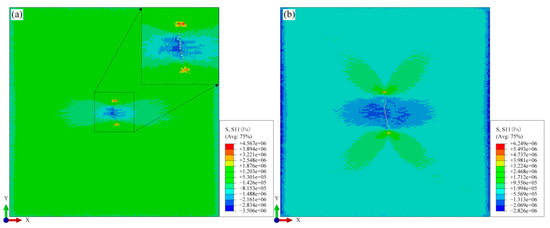 Horizontal stress contours at different fracturing stages under the mineral-heterogeneity model. (a) is the initial stage of fracturing. (b) is the middle stage of fracturing. Minerals indirectly affected the fracture-propagation path by changing the stress distribution.