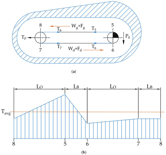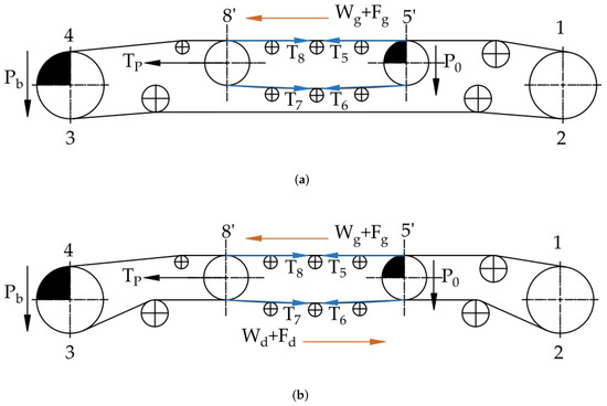 The research consisted of measuring the operating parameters of the intermediate drive in two variants: with coupling only at the carry side (Figure 4a) and with coupling at both sides (Figure 4b). Points on the contours refer to the characteristic places where the belt tensile force changes. It is known from previous research that the optimal conditions of friction cooperation occur when the tensile force in the driving belt (intermediate drive) is greater than in the driven belt (main conveyor) [51]. The force ratio in the belts has a significant impact on the surface pressure between the friction belts and on the transverse vibrations of the belts [1,41]. The experimental conditions were established for the tensile force in the driving belt of 5 kN and the force in the driving belt of 2.5 kN (force ratio 2:1). The entire test cycle was carried out for the linear speed of the belts of 2.5 m/s.