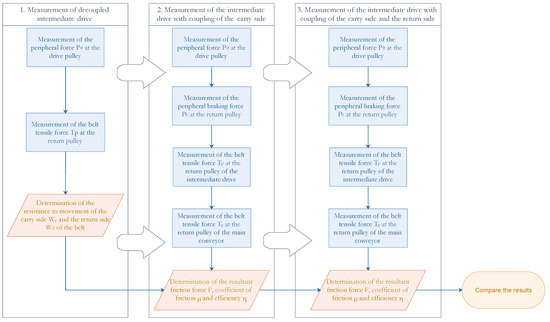 Further research should focus on the analysis of the influence of tensile force ratios of the belts on the transferred friction force. The theoretical considerations of the authors on the work of such a drive lead to the hypothesis that there may be areas where the additional return belt does not transmit the drive power. Assuming that the necessary condition for the friction force transfer at the return side is creep at the carry side, braking states may occur for a low load [1]. Similar phenomena may take place at high loads, when the creep is so high that some of the energy is dissipated into elastic deformations (circulating power) [58]. It should be clearly emphasized that these are only assumptions that require validation in further research. The results presented in the article confirm that there are certainly work areas where this type of drive can be useful. Of course, the limitation of power transmission at the return side is always the normal force (resulting from the pressure of the weight of the intermediate belt on the main belt). Heavy-duty belts (e.g., steel belts) increase the value of the normal force at the return side. This solution can be useful in belt conveyors with several intermediate drives, where it is necessary to increase the power transmission, but it is not possible (e.g., due to the available space) to install a new drive. In this case, it is possible to use the return side of the intermediate drive at the already existing conveyor structure.