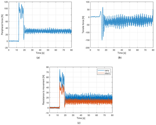 The results of measurements of the operating parameters of the short conveyor forming the intermediate drive are shown in Figure 6. Figure 6a shows the value of the peripheral force measured on the torque arm of the intermediate drive pulley, while Figure 6b shows how the belt tensile force has changed (at the take-up pulley). The measured peripheral force is the same as the resistance to motion of the entire intermediate drive conveyor and is approx. 30 N. The increase in the peripheral force should be consistent with the decrease in the tensile force at the tail pulley. This is because the average tensile force in the belt is constant and the length of the belt loop does not change. The obtained results confirm the correctness of this assumption. The measurements were carried out for a belt speed of 2.5 m/s, which was constant in all measurement series. The plots show the data from the load cells before the start of the conveyor, start-up and stable operation of the conveyor. The values recorded during the stable operation of the conveyor allow us to determine the resistance to motion of the return and carry side (Figure 6c), according to the system of Equation (13). It has been shown that the resistance to the motion of the carry belt is approx. 18 N, while the return belt is approx. 12 N.