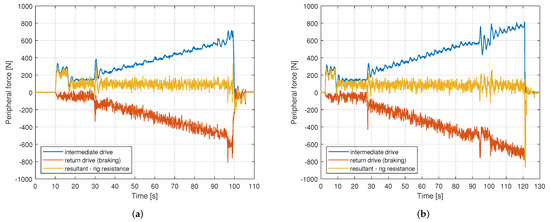 Figure 7 shows the time series of the peripheral force of the intermediate drive and the braking force at the return pulley of the main conveyor for two variants: with friction coupling only of the carry side (Figure 7a) and with coupling of both sides (Figure 7b). During these measurements, after starting the rig and stable operation, the braking torque was increased (negative values) and an increase of the peripheral force (positive values) was observed until the friction coupling was lost, which is related to the occurrence of a slip. The point of loss of friction coupling between the belts was determined based on the readings from the encoders. At the same time, there is a sudden drop in the measured forces and a change in the direction of motion. The resultant peripheral force of both drives determines the size of the total resistance to the motion of the rig (the sum of the resistance to motion of the main conveyor and the intermediate drive). In both drive cases, they are approximately equal. Working with the power transmission at the return side allows us to achieve a higher peripheral force and increase the load level of the intermediate drive before losing the the friction coupling and slip.