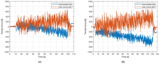 However, a full assessment of the operating status requires an analysis of the force distribution in the belt. Figure 8 shows how the tensile force of the intermediate belt and the main conveyor belt changed for two variants of operation. A decrease of the intermediate belt tensile force is observed at the take-up pulley. For the assumption of a constant average belt tensile force, this means that the tensile force increases in the power transmission sections. In the case of coupling, it is only the carry side of the intermediate drive (Figure 8a); the increase of the tensile force on the transmission sections is smaller than for the variant of the coupling of the two sides (Figure 8b). At the same time, an increase of the tensile force of the main belt at the take-up pulley was observed. This means that the friction force was transferred from the intermediate belt to the main belt, and the intermediate drive takes the load of the main conveyor. These results are consistent with the theoretical assumptions of the intermediate drive operation without division into the number and type of power transmission sections.