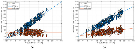 In order to determine the correct distribution of friction forces, it is necessary to know about the tensile forces of the belt at characteristic points. This is a technical problem as there are only a limited number of measuring methods, and they generally require complicated equipment to be installed and have contact with the belt. There are solutions based on the [53] roller measurement system, but the method affects the resistance to motion of the test rig, which makes it impossible to apply due to the assumptions described in the research methodology. Due to the practical complexity of measuring the forces in the belt anywhere along their length, it is necessary to determine them on the basis of theoretical assumptions. The distributions in Figure 9 show that the new drive variant allows the power to be transferred also at the return belt. The value of the maximum possible transferable friction force at the carry side is similar for the two variants. For the variant shown in Figure 9b, however, we obtain a higher resultant friction force, which results from additional sections of the friction coupling at the return side. These results were clearly confirmed in Figure 10. The level of the possibility of power transmission is determined by the maximum friction force achieved when the belts lose their sticking friction, i.e., after reaching a slip. The return belt causes the slip to occur with a higher peripheral force for the same working conditions of the conveyor. For both variants, it was possible to achieve and register the operating states with slip, and to estimate the friction coefficient equal to approx. 0.72. The measured values of the coefficient are the same as the results obtained in other studies for the rubber–rubber friction pair [54,55,56]. Similar coefficients of friction for the two tested variants confirm the correct estimates of the normal force and the correctness of the measured operating parameters.