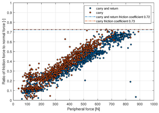 The kinetic friction coefficient determined according to Equation (23) for both considered cases is approx. 0.72. The averaged values of the coefficient of friction in relation to the peripheral force are shown in Figure 11.