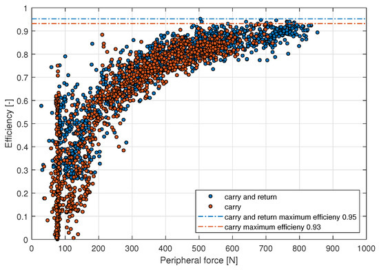 Mechanical efficiency as a function of intermediate drive peripheral force for two work variants.