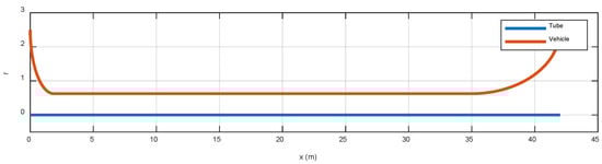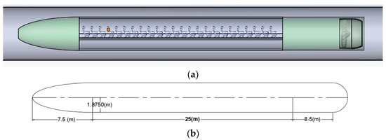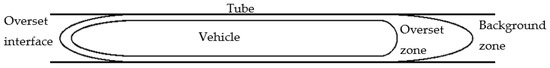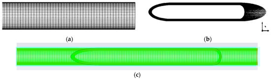 A 2-D CAD model, shown in Figure 4, was utilized to simulate the vehicle. The movement was applied to the overset cell zone to simulate the vehicle’s movement within the tube. The overset grid method [44,45,46] was implemented to generate the relative motion between the vehicle and the tube. Two subdomains share the computational domain (Figure 5): a stationary subdomain defined by the tube (Figure 5a) and a moving subdomain (Figure 5b) surrounding the vehicle in close proximity.