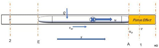 The aerodynamic phenomenon caused by the vehicle’s movement traveling in a tube includes the propagation of compression waves and expansion waves, studied theoretically [2,3,4] and experimentally [5,6,7]. CFD has been increasingly used in developing high-speed vehicles [8,9,10,11,12,13,14,15,16]. Most relevant to a vehicle in a tube include those investigating high-speed trains traveling through tunnels. Similar to the tube, the tunnel introduces a blockage effect, highlighted as a constraint to the train’s performance and the tube operating pressure [17,18,19,20]. Significant time and cost reductions are achieved, particularly in the initial design, if a simpler but accurate theoretical model is well established [2,21]. High-order computational models such as Unsteady Reynolds-Averaged Navier–Stokes (URANS) are more expensive than lower-order models, since the lower-order models usually simplify the model into fewer dimensions in the spatial and temporal schemes [22]. However, theoretical analysis using the Method of Characteristics (MoC) has been applied successfully to unsteady problems in high-speed land transportation [8,9,10,11,12]. Early work [4] on a vehicle in a tube using 1-D analysis demonstrated that the flow-field near the vehicle is not affected by the unsteadiness of the distant traveling waves. More recently, Woods [2], Juan Rivero et al. [23,24], and Gilbert [25] used the MoC to tackle the flow-field generated by a high-speed train entering a tunnel, and a semi-empirical method was introduced to negotiate the sonic boom of the strong wave exiting the tunnel [26,27,28,29,30]. Experimental data on the vehicle traveling in a long tube are scarce [31]. A 26 km open-ended tunnel with a square cross-section was built [32] to investigate techniques to reduce the compression wave strength generated by the train traveling within the tunnel [33,34].