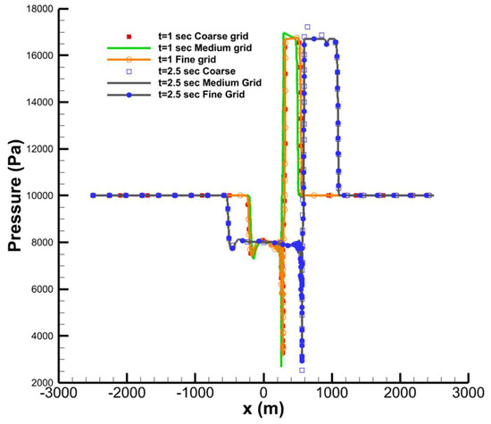 Pressure distribution at y = 2 m (between the tube and the vehicle), t = 1, 2.5 s, with different grids using the k- realizable model. The pressure and Mach number contours provided in Figure 10 were obtained with the k-ε turbulent model. The solution represents a compression in front of the vehicle that causes the “piston effect” [52].