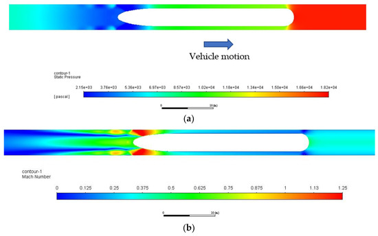 Figure 10a indicates the static pressure contour around the vehicle. The pressure is exceptionally high downstream (red colormap) and expanded into the left. The calculations performed by MOC show a value of 23 KN. Figure 10b reveals the high Mach number experienced at the rear part of the vehicle due to flow expansion.