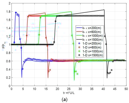 (a) Pressure ratio, (b) temperature history reported at x = 200, 600, 1000, 1500 (m) .
