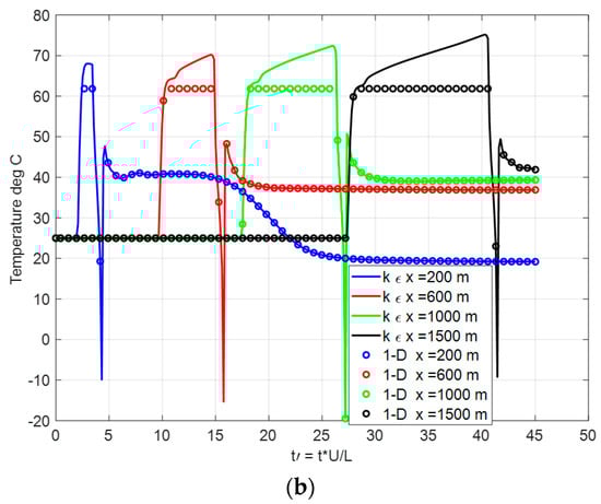 The far-field flow solution for the compression wave propagation along the tube requires a time–space-dependent solution. The methods described in Section 1 for the 1-D algorithm solutions support a time history for the flow-field variables. The new algorithm results were compared with an unsteady turbulent k-ε model. Obtained results agree in predicting the pressure wave and flow properties’ distribution along with the tube domain. For the near-field flow properties around the vehicle, Figure 11 shows the time history for pressure (a) and temperature (b) measurements monitored using artificial probes fixed at different x-locations along the tube (x = 200, 600, 1000, 1500 m). URANS results are in excellent agreement with the developed algorithm. The 1-D algorithm and URANS estimate the temperature variations at prescribed locations. The numerical results agree very well, but the 1-D provides a lower maximum pressure and temperature value than the turbulent model of k-ε The temperature measurement shows a maximum of around 72 °C, which means that a higher operating temperature is expected. The system is adiabatic, and no heat source is defined. The temperature variation generated from the flow-field area changes and the domain’s expansion/compression causes the waves’ appearance. Another explanation as to why the turbulence model of k-ε expects a higher temperature may be that also the viscous dissipation into thermal energy is the source of the higher temperature levels shown in Figure 11b [53].