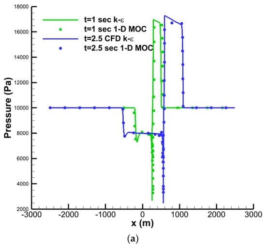 Figure 12a,b show the pressure wave propagation in space and time. Figure 12a shows the pressure wave propagation at two flow times. During the flow time = 1 s, the developed algorithm and the CFD solutions for the pressure wave propagation predict that the propagation distance lies near 300 (m), which (), but at t = 2.5, the wave propagates to more extended spaces, almost twice the previous wave propagating period (15 L). The good agreement between the developed algorithm and the 2-D URANS provides high robustness for the model, requiring less computing time for the rapid prediction of the flow-field of high-speed vehicles traveling in a tube. The current method’s computational time is negligible compared to the complex grid motion applied to generate the results of the k-ε model. The computational time calculated with different grid sizes is shown clearly in Table 3 below.