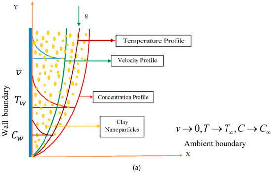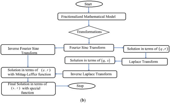 The rectilinear system of coordinates is cogitated. Let us consider the flow in the y direction and the x axis to be normal to the plate and the plane filled with nanofluid to contain clay nanoparticles. In the initial state , the plate surface and nanofluid in the region are in a static condition, and after elapsing at a certain time , the plate moves with velocity U, and at the same time raises its temperature to . The buoyant force is the essential mechanism in driving the fluid through gravity by pulling down. Since the plate has an infinite length, the boundary layer thickness is considerably small in comparison; hence, all the flow fields only function for one special coordinate and with respect to time. The geometry of the problem and the flow chart of the present work are shown in Figure 1a,b. The governing equations of momentum, energy, and concentration describing the fluid flow phenomena are formulated according to simplified pressure gradients and body force in the Navier–Stokes equation and presented in dimensionless form with the Caputo fractional derivative as follows [29,39]: