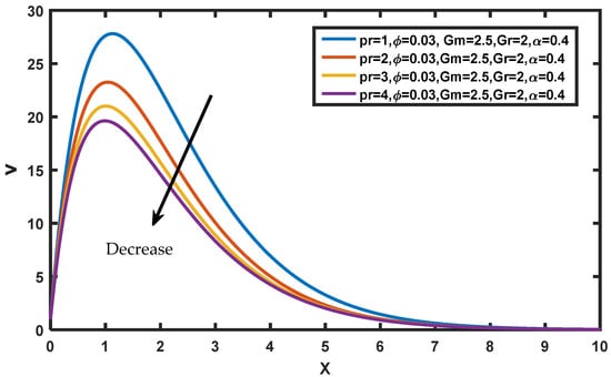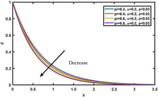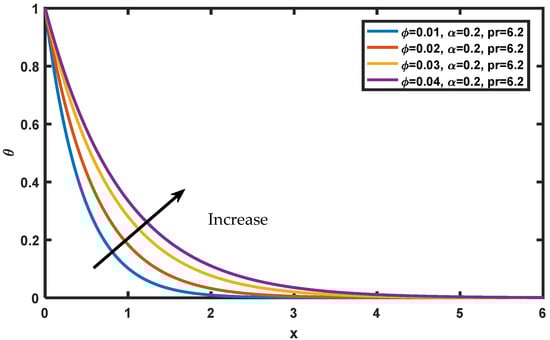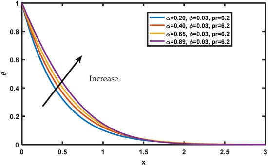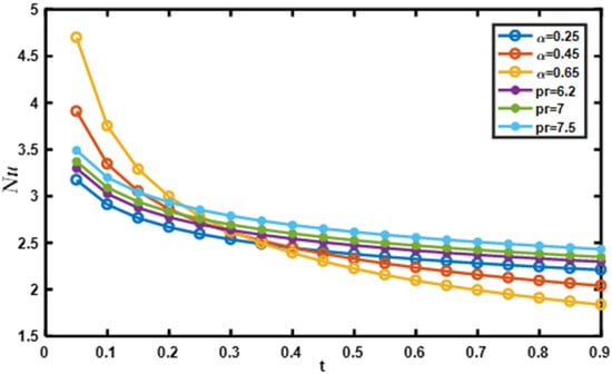 Figure 6 exhibits the flow curves for the variation in values; it can be seen that increasing the order of the fractional derivative causes an increase in the fluid momentum. It is true that increasing time leads to an increase in the flow field, which may explain this result. Figure 7 depicts the effect of (nano-sized particle volume fraction) on fluid temperature, and hence it is noticed that with increasing the nanoparticle increases the temperature profile. This is because the increase in the density of nanoparticles causes a rise in heat conductivity. Figure 8 depicts that increasing the value of the Prandtl number makes the fluid’s thermal conductivity go down, so the temperature of the nanofluid goes down due to low thermal diffusivity.
