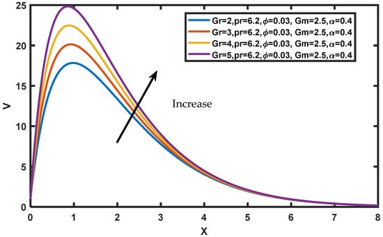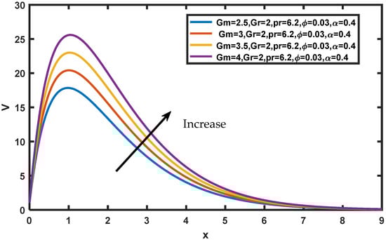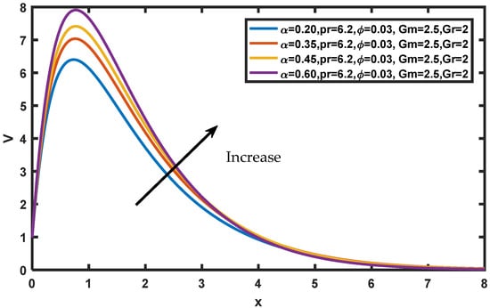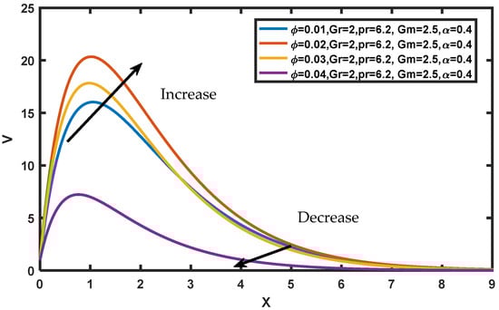 As demonstrated in Figure 3 and Figure 4, the influence of Gr and Gm on the fluid flow behavior is discussed. Here, indicates that the plate is cooled down and denotes that the plate is heated up. The fluid temperature rises dramatically when the plate is cooled, while heating greatly slows it down. It is noticed that, from the flow pattern, fluid velocity increased in Gr and Gm when the surface of the plate is a coolant. This explains the physical fact that when Gr and Gm rise in buoyancy ratio, there is a better improvement and enhancement in the species buoyancy force. Figure 5 illustrates the impact of nanoparticle volume fraction on dimensionless velocity. Initially, the velocity of nanofluids is revealed to have an inverse relationship. Adding nanoparticles to a fluid increases its density, which reduces both the boundary layer thickness as well as nanofluid velocity; it is noted that with elapsed time velocity decelerates.