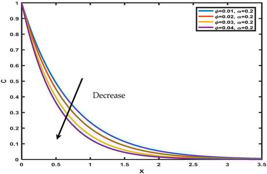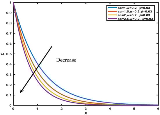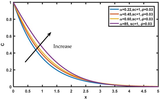 The temperature profiles for different values of are shown in Figure 9, while the other parameters are held constant. The Caputo fractional parameter’s rising function grows as the temperature increases. The uniqueness lies in explaining how temperature rises as the fractional operator’s order grows. Increases in order have a significant influence on time values because of the memory effect inherent in fractional operators, which leads to a large accumulation. When the order of the fractional operator is increased, it is seen that a rise in time consequently leads to an upturn in fluid temperature. A sub-diffusion in the range of (0, 1) is also noted. Caputo’s fractional derivative sub-diffusion is confirmed by the literature’s conclusions when the order is changed (0, 1). For different magnitudes , and , the curve patterns on the species are represented in Figure 10, Figure 11 and Figure 12. It is noticed that the concentration drops with a rise in Schmidt number, but increases as increases. The concentration decreases for distinct values of volume fraction , and it is observed that the concentration levels in the fluid become stationary as they move far away from the plate. Figure 13 and Figure 14 display the engineering interests via rate of change of heat and mass for various pertinent physical parameters. In Figure 13, it can be seen that Nusselt number increases significantly with an increase in Prandtl number and fractional value and then decreases with time. From Figure 14, a small amount of growth can be seen in the Sherwood number as rises, and with increasing Sherwood number increases.