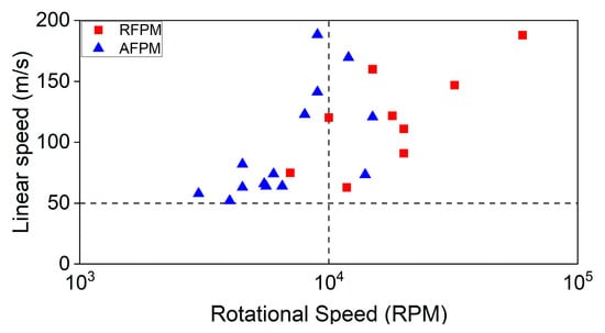 To determine the standard value defining the high speed based on the linear speed, the relationship between the rotational speed and linear speed was summarized, as shown in Figure 2, by calculating the linear speed of the RFPM prototypes presented in ref. [,,,,,,,,,], which defined high speed based on the rotational speed. It can be confirmed that the linear speed of an RFPM with a rotational speed of ~10,000 rpm or more is 50 m/s or more. Thus, in this paper, the linear speed of 50 m/s is defined as a standard speed for an HSAFPM.