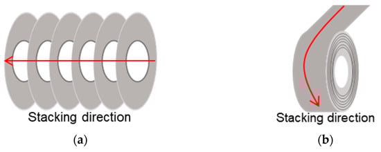 The authors of [] used a coreless SSDR to reduce the eddy current loss. Coreless (ironless) stators have no cores or are made of nonmagnetic materials. Thus, magnetic flux paths are either not created or are very short. Therefore, there is almost no eddy current loss in the stator. However, if a coreless stator is used, the leakage of the magnetic flux flowing from the PM to the stator is large. Thus, its disadvantage is that it may lead to a lower power density than that of a cored SSDR. The authors of [] used a wound core stator to reduce the eddy current losses in an SSDR AFPM. Unlike stacked cores, which are manufactured by stacking steel sheets, as shown in Figure 3a, wound cores are manufactured by rolling steel sheets, as shown in Figure 3b. In the AFPM, the magnetic flux flow is in the axial direction. Therefore, a wound core that is laminated in a direction perpendicular to the magnetic flux, i.e., a radial direction, is more advantageous than a stacked core that is laminated in the axial direction.