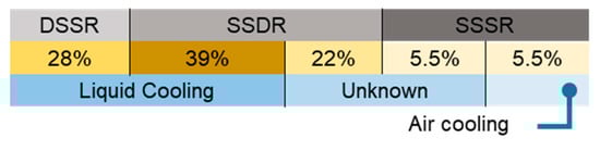 All cooling methods of the HSAFPM prototypes listed in Table 1 are schematically shown in Figure 4. Of the 16 prototypes, 27.5% have an unknown cooling method, 5.5% use air cooling, and the remaining 67% use liquid cooling. The main advantage of air cooling is its simple structure. However, its cooling performance is inferior to that of water cooling. Although liquid cooling has a relatively good cooling performance, it makes it difficult to form a flow path and increases the machine’s weight.