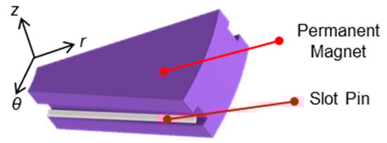 Unlike [], which used an adhesive to fix the PM, Zhouran Zhang et al. [] fixed the PM through a special PM shape and slot pins, as shown in Figure 5. The authors fixed the magnet so it does not move in the axial direction by inserting a slot pin into the slot opening of the PM.