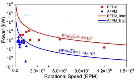 In the second step, the “speed–output power” characteristic was defined and analyzed to predict the limit when applying the AFPM to high-speed applications. This step is covered in Section 6, which also defines a function that determines the limit of the “speed–output power” of the high-speed AFPM machines presented in the collected literature. Through this definition, it is possible to estimate the limit of the speed range that can operate within the required output power range. Additionally, by comparing and analyzing the speed–output power limit curve of the AFPM and the speed–output power limit curve of the RFPM, the advantages and disadvantages were identified, and the limits of the AFPM were presented more objectively.