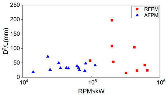 Figure 2 organizes the relationship between the rotational speed and linear speed of high-speed RFPM machines. By indicating the relationship between the rotational speed and linear speed of the AFPM products listed in Table 1, the difference between the relative speed ranges of the RFPM and AFPM can be observed. That is, in terms of the linear speed, both the RFPM and AFPM are equally distributed between 50 m/s and 200 m/s. However, the RFPM is mostly located on the right side of the graph, showing a rotational speed of 10,000 RPM or more. Conversely, the AFPM, which has a relatively large rotor diameter, is mostly located on the left side of the graph, showing a rotational speed of 10,000 RPM or less.