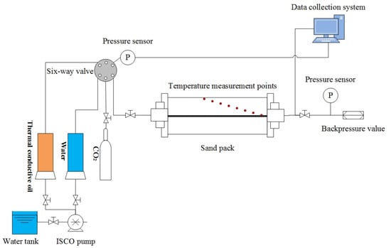 The apparatus was mainly composed of an injection system, sand pack, and temperature data acquisition equipment. The injection system mainly included a high-pressure CO2 bottle, gas controller, and ISCO pump. Heat-conduction oil and CO2 could be injected into the sand pack. The temperature data acquisition equipment mainly included a temperature sensor system and computer equipment. The seven temperature measuring points are equally spaced and distributed between the surface of the heater and the pipe of the sand pack. The computer equipment monitored and recorded temperature changes in the sand pack over time. The sand pack was located in the insulation sleeve to heat and compensate for the heat loss and maintain the targeted temperature. There were pressure sensors on the inlet and outlet sections of the sand pack, which were connected to the data acquisition system and used to measure and record the pressure across the sand pack in real-time.