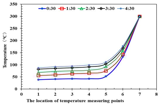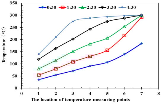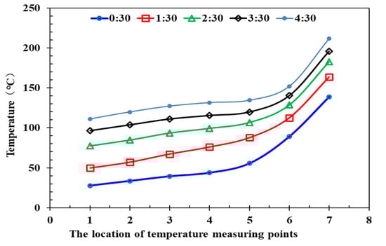 Figure 3 shows the heat transfer characteristics of the model when injecting water. As shown in Figure 3, after four-and-a-half hours of heating, the temperature in the sand-filling tube increased with time. The final temperature of the No.7 measurement point, which was the nearest to the heating rod, was 210 °C, while the adjacent No.6 measurement point was 158 °C, while the No.1 measurement point, which was the furthest from the heating rod, was 117 °C. It can be inferred from these experiments that the heat transfer effect of water is much greater than that of gas, and the convection heat transfer between water molecules is fast, so the heating tube had a wider range while water was injected. The sand-filled tube heater had been heated at full power, but the surface of the heater dissipated quickly, and the surface only reached 210 °C after 4 h of heating, which did not reach the set temperature of 350 °C.