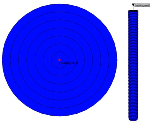 To study the effect of heat-conduction oil and water injection on SAGD electrical preheating processes in heavy oil reservoirs, CMG software was used for numerical simulation. A laboratory-size radial model of 7 × 1 × 80 was established by CMG-STARS multi-component thermal recovery numerical simulation software. The experimental scale of the mechanism model is shown in Figure 5, and the parameters are shown in Table 1.