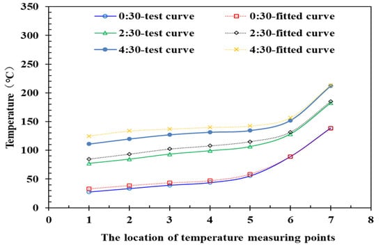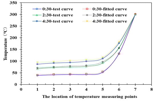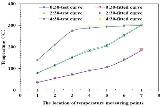 As shown in Figure 6, Figure 7 and Figure 8, after fitting the heat transfer effect of different saturated media, it was found that the difference in temperature between the physical and fitting tests was small, indicating that the experimental calculation parameters were accurate. The parameter values used in the final calculation are shown in Table 2.