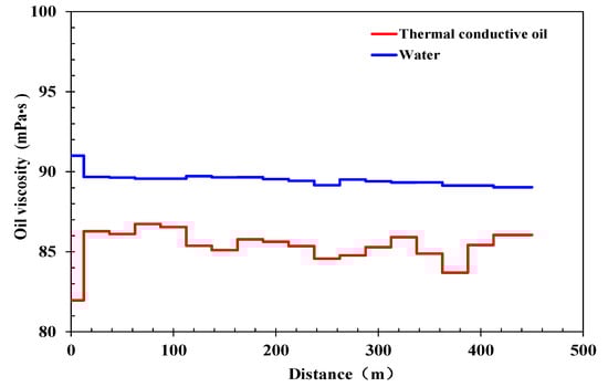 Figure 10 shows the oil viscosity between the injection and production well. As shown in Figure 10, when wellbores were saturated with water, the oil viscosity recovery between injection and production well was 89 mPa.s after preheating 300 days, which is similar to 85 mPa.s when wellbores were saturated with heat-conduction oils. The experiment’s results showed that compared with the wellbore saturated with water, heat-conduction oil could not obviously reduce the viscosity of crude oil during the preheating stage. The reason was that although the heat-conduction oil has excellent wellbore heat-conduction effects, when the average injection volume of IP wells was as high as 200 tons, according to the simulation results, it could be seen that the heat-conduction oil spread only 1.5 m in the vicinity of the well at the end of preheating. The effect of accelerating the connection of the interlayer oil was limited.