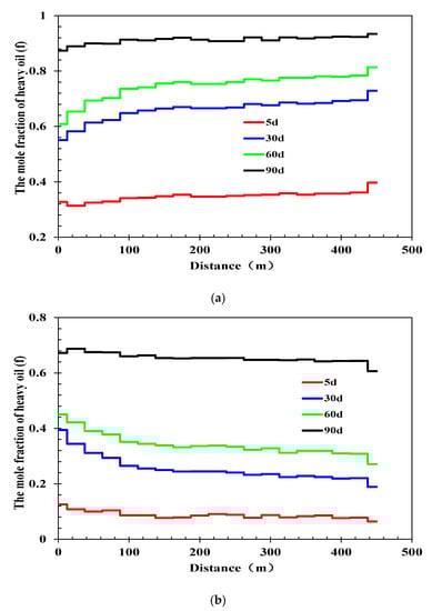 Figure 11 shows the mole fraction of heat-conduction oil and super-heavy oil changes with time. As shown in Figure 11, on the fifth day, the mole fraction of heat-conduction oil in the wellbore was 0.91, and the mole fraction of super-heavy oil was 0.95. On the ninetieth day, the mole fraction of heat-conduction oil in the wellbore was 0.33, and the mole fraction of super-heavy oil was 0.66. The results indicated that the mole fraction of heat-conduction oil in the wellbore decreased with the increase in heating time, and the mole fraction of super-heavy oil in the wellbore increased with the preheating time increasing because heat-conduction oil has a good ability to dissolve super-heavy oil. The super-heavy oil flowed into the wellbore due to the solubility of the heat-conduction oil and its own gravity. As a result, the super-heavy oil content in the wellbore gradually accumulated, increasing the risk of coking.