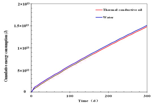 Figure 12 shows the comparison of energy consumption during SAGD electrical preheating. As shown in Figure 12, the cumulative energy consumption when water was injected into the wellbore was only 1.5% more than when the heat-conduction oil was injected. The energy-saving effect of heat-conduction oil was not obvious. At the same time, the cost of heat-conduction oil reaches 1800 USD/ton, which is far greater than the cost of water. From the perspective of cost and preheating effects, injecting water into a wellbore is more feasible and economical during the preheating process of SAGD.