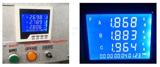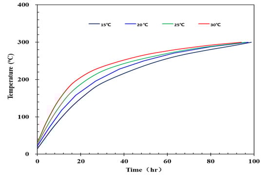 Figure 14 and Figure 15 show the heating characteristics of the actual wellbore. As shown in Figure 14 and Figure 15, the wellbore quickly heated up in the initial stage. It took longer for the wellbore to reach 300 °C. The higher the foundation temperature, the less time the wellbore took to reach 300 °C. The higher the formation temperature, the shorter the heating time to read 300 °C. When the temperature reached 200 °C, the heating rate slowed down. The original reason was that the heat transfer loss from the wellbore increased. When the foundation temperature was 20 °C, the wellbore temperature reached 300 °C after heating for 98 h. According to the temperature display of the control box, before the temperature in the wellbore reached 300 °C, the total heating power was 2.698 KW; when the temperature of the wellbore reached 300 °C, the total power required to maintain the temperature dropped to 1.868 kW, which was 69.2% of the initial power.