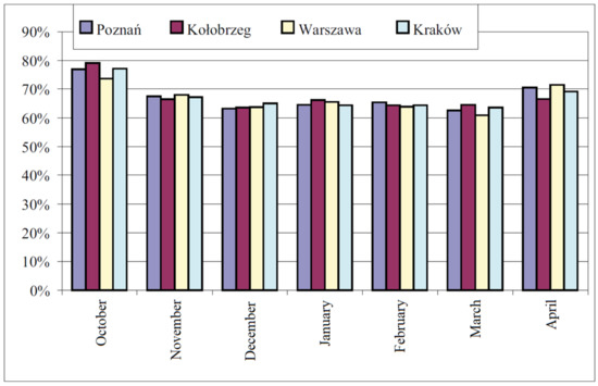 The percentage coverage of heat demand for ventilation through a ground heat exchanger (Poznań, Kołobrzeg, Warszawa, Kraków) [1].