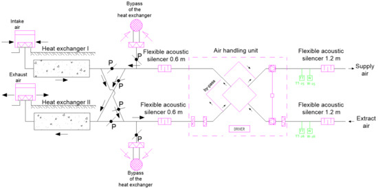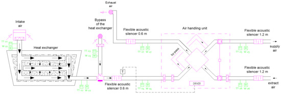 The possibilities for using direct-contact, gravel, ground, air heat exchangers are numerous. They can be used wherever it is desirable to reduce primary energy consumption. The most common solution is to use GGAHE for the preparation of preliminary air (thermal and humidity control) in single or multi-family buildings, but also in industry [15,16]. Figure 2 shows the diagram of the application of direct-contact gravel, ground, air heat exchangers for a single-family building in the passive standard [17,18,19], located in Sierosław (near Poznań). Figure 2 shows the applied technological system with an indication of the measuring equipment. Currently, measurement data of temperature and relative air humidity in seven measurement points are collected. During the winter, the air collected by the field probe flows through the ground gravel heat exchanger, and then is directed to the air-handling unit equipped with highly efficient heat recovery (>90%), and is subsequently blown into the rooms. In summer, the air bypasses the heat recovery exchanger located in the air-handling unit through the by-pass, because in this period the ground heat exchanger ensures 100% supply of cold air within the building. In the transitional periods, it is possible to draw fresh air using an additional wall intake, built on the external wall of the building, the so-called bypass system of the ground heat exchanger. During this time, the gravel deposit is regenerated. In addition, during the winter season, if the gravel heat exchanger is over-exploited, an electric inlet air heater is used to avoid cross-freezing of the heat recovery heat exchanger located in the air-handling unit. The presented system is effective; during the winter it provides heating of the extracted ventilation air to positive temperature parameters (TC > 0 °C) and regulation of the relative humidity of indoor air in the building at the level of φWEW > 30%, while during the summer season it is responsible for total dissipation of heat from the building, maintaining a comfortable temperature inside the building at the level of TWEW < 24 °C, at the same time as regulating relative humidity, which does not exceed φWEW < 70%. As a result of air contact with the ground in GGAHE, the soil gets drained during hot summer periods, moisturized in winter, and cleansed.