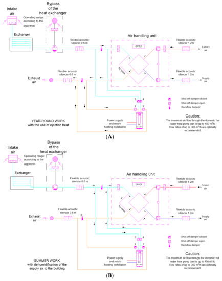 In more complex applications, the GGAHE can be integrated from the heating and cooling source for passive buildings while creating complete heating, cooling, and ventilation systems. A proposal for this is shown in Figure 4A,B.